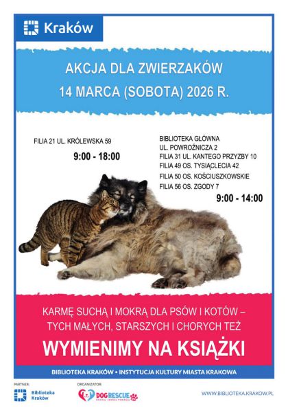 W kilku filiach Biblioteki Kraków będzie trwać akcja „Książka za karmę”