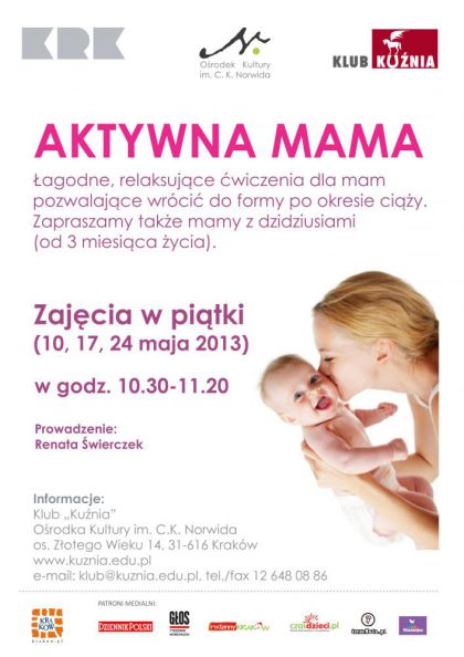 Zapraszamy do Klubu Kunia OKN aktywne mamy na agodne, relaksujce wiczenia pozwalajce wrci do formy po okresie ciy. Zapraszamy take z dzidziusiem przytulonym do mamy (od 3 miesica ycia).