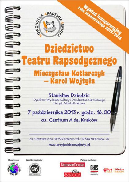 Orodek Kultury Krakw-Nowa Huta oraz Stowarzyszenie Przyjaci Nowej Huty zapraszaj na uroczyst inauguracj nowego roku akademickiego w Nowohuckiej Akademii Seniora, ktra odbdzie si 7 padziernika o godz. 16.00 (os. Centrum A 6a).