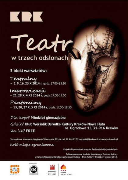 Klub Wersalik Orodka Kultury Krakw-Nowa Huta (os. Ogrodowe 15) zaprasza gimnazjalistw do udziau bezpatnych warsztatach Teatr w trzech odsonach, organizowanych jako jedna z inicjatyw w ramach projektu Od potrzeby do pomysu. Realizacja inicjatyw lokalnych. Autorami pomysu s: Emilia Wysocka, Natalia Jarosik, Zuzanna Kubal, Artur Siudak.