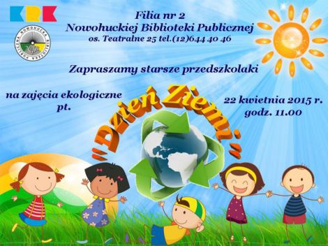 Biblioteka zaprasza starsze przedszkolaki na zajcia o tematyce ekologicznej pn. Dzie Ziemi, w cyklu: Bd Eko. Dzieci dowiedz si, jak naley dba o planet, ktra jest domem wszystkich ludzi. Uczestnicy spotkania poznaj odpowiedzi na wiele nurtujcych pyta dotyczcych ekologii i recyklingu.