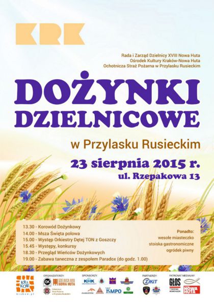 Tradycj s obchodzone w caym kraju, kocem sierpnia kadego roku wita plonw. Podtrzymujc ten zwyczaj, Rada i Zarzd Dzielnicy XVIII Nowa Huta, Orodek Kultury Krakw-Nowa Huta oraz Ochotnicza Stra Poarna w Przylasku Rusieckim zapraszaj na tegoroczne Doynki Dzielnicowe, ktre odbd si w niedziel 23 sierpnia w Przylasku Rusieckim (ul. Rzepakowa 13). W nowohuckich osiedlach wci wielu mieszkacw posiada swoje wasne pola i zajmuje s(...) ... więcej » |