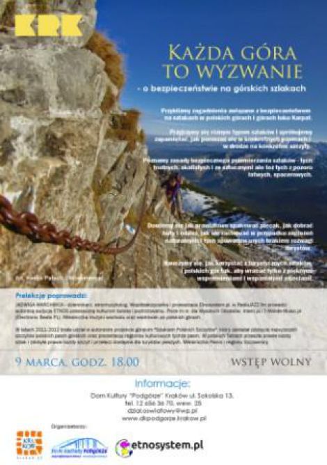 Jadwiga Marchwica przybliy suchaczom zagadnienia zwizane z bezpieczestwem w grach. Podczas prelekcji bdzie mona si dowiedzie m.in. o rnych typach szlakw, jak porusza si w konkretnych pasmach i w drodze na konkretne szczyty., a take jak prawidowo spakowa plecak, jak dobra buty i odzie oraz jak si zachowa w przypadku zagroe naturalnych i tych spowodowanych brakiem rozwagi turystw.