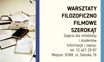 Zapraszamy modzie i studentw na warsztaty filozoficzno - filmowe "Szerokt". Uczestnicy maj moliwo zapoznania si z myl filozoficzn, filmow, teoria kultury, zajcia warsztatowe umoliwiaj im dyskusj z twrcami i artystami, rozwijaj umiejtnoci analityczne i interpretacyjne i ksztatujce wiadomy odbir przekazu filmowego, a take moliwoci zastosowania wiedzy filozoficznej do odkrywania znacze zawartych w tkance dziea filmowego(...)  ... więcej »