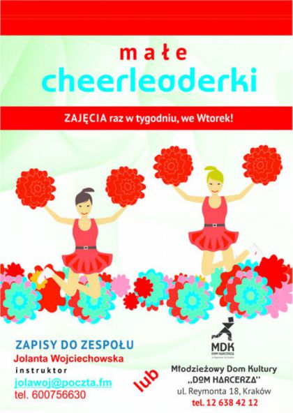 Cheerleaderki zapraszaj na zajcia we wtorki w godzinach od 17.40 do 19.15. Nowa sala baletowa, nowe wyzwania i moliwoci! W ramach zespou prowadzone s zajcia dla Cheerleaderek z elementami taca towarzyskiego. Wiek uczestnikw 6-12 lat. Zapraszamy!(...)  ... więcej »