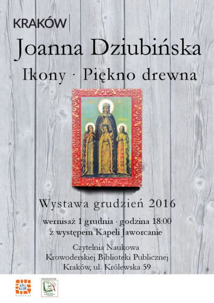 Zapraszamy na wystaw Joanny Dziubiskiej "Ikony - pikno drewna". Na wernisa wystawy z wystpem Kapeli Jaworcanie zapraszamy 1 grudnia o godzinie 18:00.