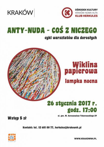 Klub Herkules Orodka Kultury Krakw-Nowa Huta (ul. Gen. M. Karaszewicza-Tokarzewskiego 29) zaprasza 26 stycznia o godz. 16.30 na kolejne warsztaty dla dorosych z cyklu Anty-nuda. Tematem spotkania bdzie papierowa wiklina. W czasie warsztatw nauczymy si jak przygotowa papierow wiklin oraz jak krok po kroku wykona z niej lampk nocn. Kady z uczestnikw opuci spotkanie z samodzielnie wykonan prac. Masz wolny czas przyjd do nas!