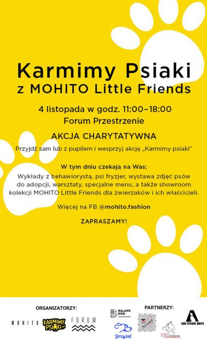 W sobot 4 listopada kady mieszkaniec Krakowa bdzie mia okazj spdzi przyjemnie czas i jednoczenie pomc porzuconym zwierzakom! Wanie wtedy w Forum Przestrzenie odbdzie si wydarzenie Karmimy Psiaki z mark MOHITO. Na uczestnikw czeka wiele atrakcji, m.in. bezpatne zajcia z psim behawioryst, warsztaty robienia zabawek dla zwierzakw czy showroom z ubraniami dla psw i ich wa(...)  ... więcej »