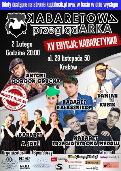 Szykujemy dla Was kolejn, ju XV edycj Kabaretowej PrzegldARKI! W programie kabaret z wygldu i podejcia typowo mskiego, Stand-up + One Man Show oraz kabaret cakowicie, niepodwaalnie i nieodwracalnie eski! Czyli specjalnie dla Was pena rnorodno humorystyczna i komediowa. A dokadniej: