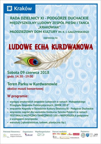 | Ludowe Echa Kurdwanowa odbd si po raz 3. Jego organizatorem jest Midzyszkolny Ludowy Zesp Pieni i Taca Krakowiak i MDK im. K.I. Gaczyskiego. Wydarzenie ma na celu promowanie kultury i sztuki ludowej (w tym rkodzielniczej), a take wzmacnianie wizi lokalnych. Jego adresatami s mieszkacy dzielnicy XI Krakowa Podgrze Duchackie, jak rwnie mionicy i pasjonaci folkloru. W programie pojawi si m.in. wystpy amatorskich zespow fo(...) ... więcej » |