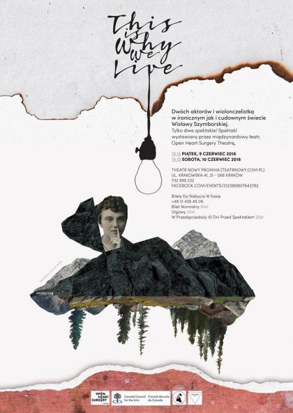 Midzynarodowy fizyczny teatr, Open Heart Surgery Theatre prezentuje 14 wierszy Wislawy Szymborskiej w trzech jzykach (angielskim, francuskim i polskim); czc poezj z teatrem, muzyk na ywo i collage.Jest to wyjtkowa wsppraca midzy kanadyjsk grup teatraln a francuskim LEnfurmerie, gdzie dwch aktorw i wiolonczelistka mierzy si ze zoonym wiatem Szymborsk(...) ... więcej » |