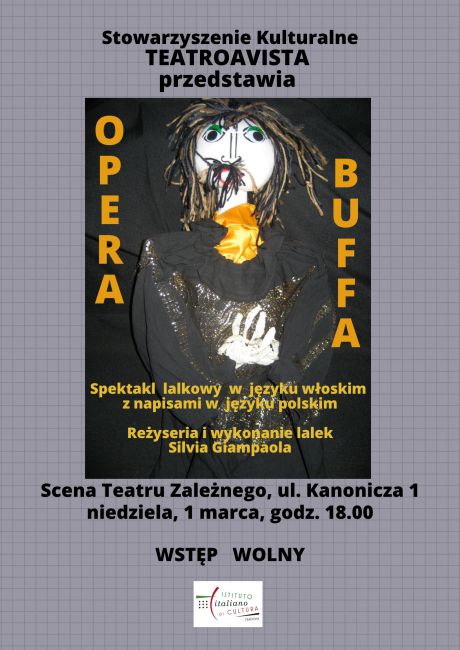 Woski Instytut Kultury w Krakowie oraz Stowarzyszenie Kulturalne TEATROAVISTA zapraszaj na kukiekowy spektakl teatralny Opera Buffa z lalkami animowanymi przez cztery woskie aktorki: Silvia Giampaola, Elena Stabile, Francesca Rizzi, Chantal Gori.