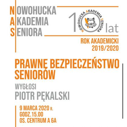 Nowohucka Akademia Seniora (os. Centrum A 6a) zaprasza 9 marca o godz. 15.00 na wykad Prawne bezpieczestwo seniorw. W zawiociach polskiego prawa gubi si czasem nawet obeznani z nim na co dzie prawnicy, a co dopiero seniorzy. Osoby starsze czsto nie zdaj sobie sprawy, jakie zagroenia i kruczki czaj si na nich zarwno ze strony pospolitych przestpcw i oszustw jak rwnie dziaajcych cakowicie legalnie, ale dcych za wszelk ce(...)  ... więcej »