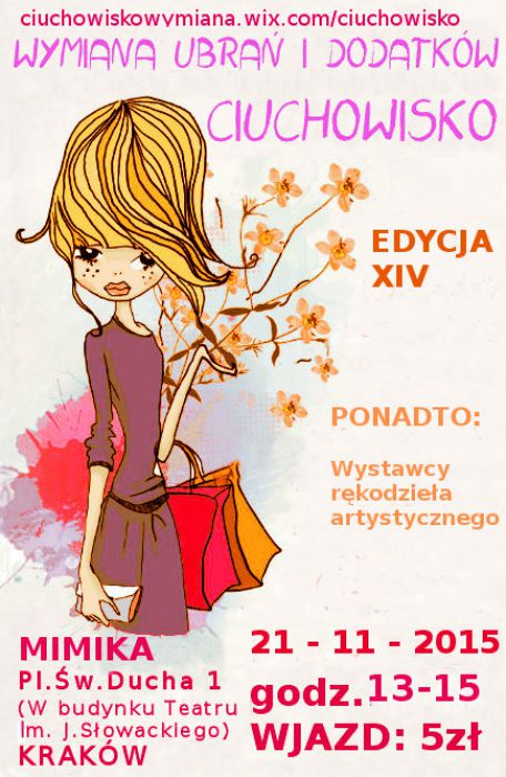 Kolejna edycja szalonej wymiany ubra i dodatkw czyli Krakowskiego Ciuchowiska. Widzimy si w Mimice (dawne Cafe Foyer) pl.w. Ducha 1. Wymiana odbywa si bdzie na stoach. Na miejscu bar z piciem i jedzonkiem:)
