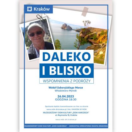 Cykl „Daleko i blisko” to niezwykłe spotkania z podróżnikami, fotografami, osobami ciekawymi świata i ludzi. Zapraszamy osoby, które chcą podzielić się swoimi wspomnieniami z podróży. Tym razem naszym przewodnikiem będzie Włodzimierz Mytnik. Prezentujemy zdjęcia z wypraw, a zaproszeni prelegenci wzbogacają te pokazy swoimi opowiadaniami. Na naszych spotkaniach nie brakuje również doznań kulinarnych, gdyż opowieści są dodatkowo okraszone poczęstunkiem związanym z omawianym miejscem czy regionem. Poczęstunek ten sponsoruje Dzielnica V – Krowodrza.
