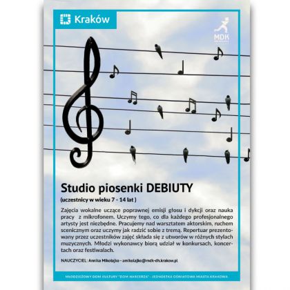 Studio Piosenki "Debiuty" to zajęcia wokalne dla dzieci od 7 roku życia, podczas których uczymy się poprawnej emisji głosu, dykcji oraz pracy z mikrofonem. Pracujemy nad warsztatem aktorskim, ruchem scenicznym oraz uczymy jak radzić sobie z tremą. Repertuar prezentowany przez uczestników zajęć składa się z utworów w różnych stylach muzycznych. Młodzi wykonawcy biorą udział w konkursach, koncertach oraz festiwalach.