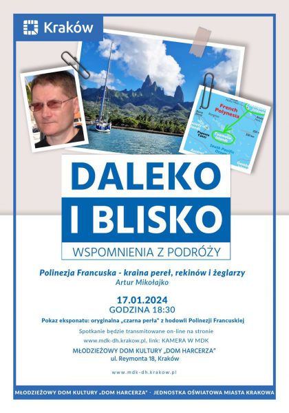 17 stycznia 2024 roku o godz. 18.30 zapraszamy do MDK „Dom Harcerza” na kolejny pokaz cyklu podróżniczego Daleko i blisko zatytułowany „Polinezja Francuska - kraina pereł, rekinów i żeglarzy". O wyprawie opowie Artur Mikołajko.