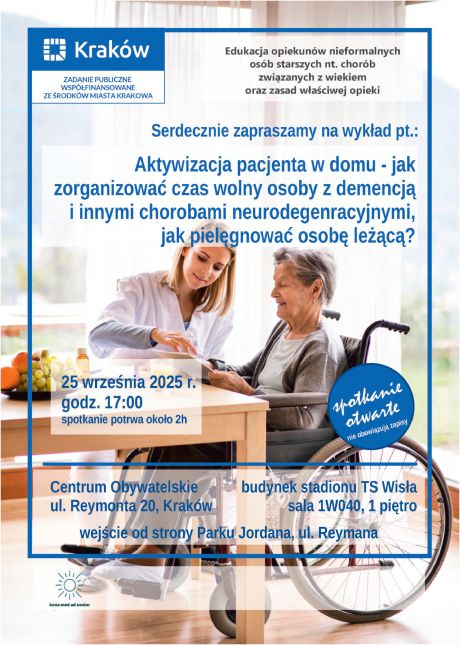 Jest to ostatni już wykład organizowany w ramach zadania z zakresu zdrowia publicznego pt. „Edukacja opiekunów nieformalnych osób starszych na temat chorób związanych z wiekiem oraz zasad właściwej opieki nad tymi osobami”, współfinansowany ze środków miasta Krakowa.