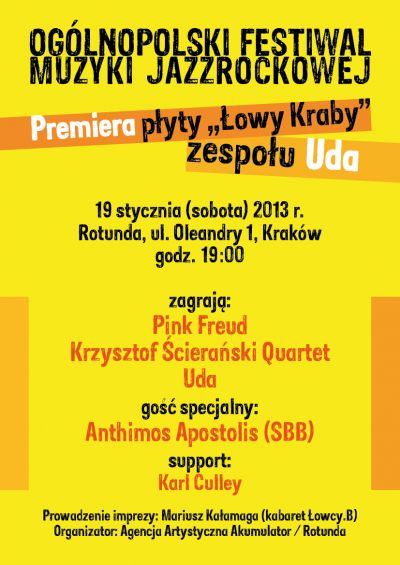 Z okazji premiery trzeciego albumu zatytułowanego "Łowy kraby", krakowskie UDA oraz Agencja Akumulator postanowiły zaprosić do wspólnego biesiadowania znakomitych goci. 19 stycznia w Rotundzie wystšpiš artyci efektowni,uznani, szczerzy i cenieni, którzy zaprezentujš różne odcieniewspółczesnego jazzu: eksperymentalno-elektroniczni PINK FREUD (prosto ztrasy koncertowej Blade Runner Tour), tradycyjno-wirtuozerski KRZYSZTOFCIERAŃSKI (z nowym kwartetem), surrealistyczno crossoverowe UDA orazakustyczno-rozpiewany KARL CULLEY.