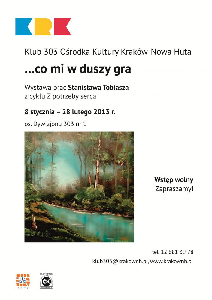 Klub 303 Orodka Kultury Kraków-Nowa Huta (os. Dywizjonu 303 nr 1) zaprasza od 8 stycznia do obejrzenia kolejnej wystawy z cyklu Z potrzeby serca. Wystawa, która jest podsumowaniem dorobku artystycznego Stanisława Tobiasza, potrwa do 28 lutego 2013 r.