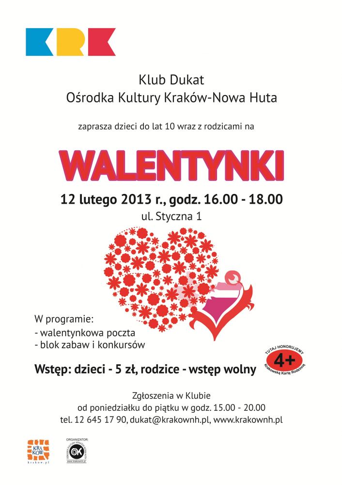Klub Dukat Oœrodka Kultury Kraków-Nowa Huta (ul. Styczna 1) zaprasza 12 lutego 2013 r. o godz. 16.00 na wspólnš zabawę dla dzieci i rodziców. W programie konkurs plastyczny na najpiękniejsze serduszko oraz walentynkowa poczta i upominki.