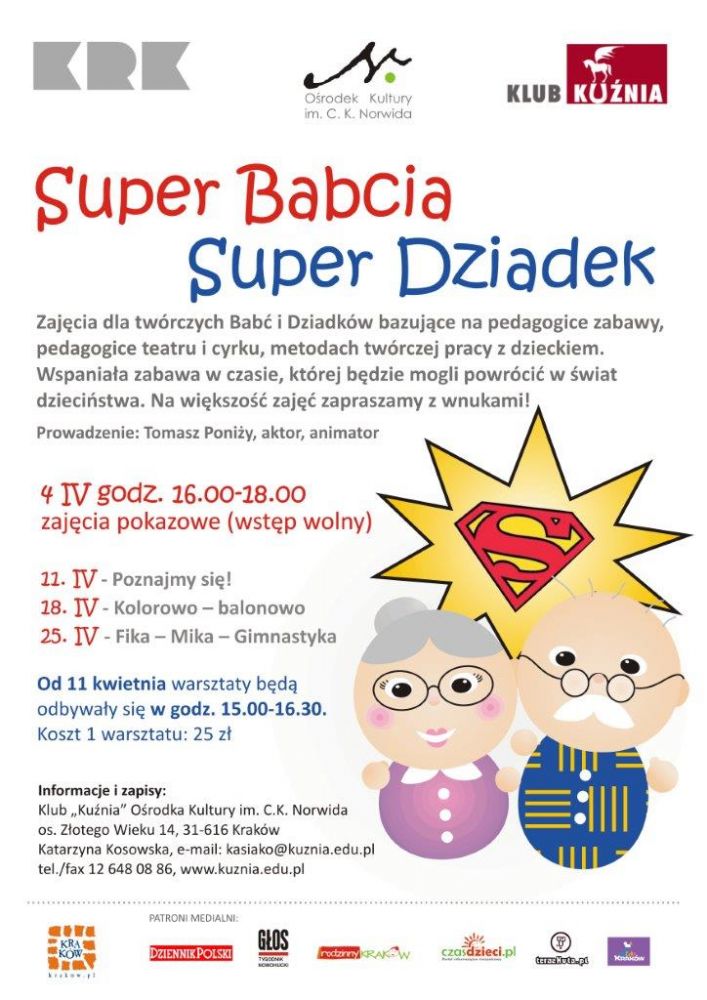 Na większoć zajęć zapraszamy z wnukami. Prowadzenie: Tomasz Poniży, aktor, animator. Zapisy: Katarzyna Kosowska, Klub Kunia Orodka Kultury im. C. K. Norwida, os. Złotego Wieku 14, tel. 12 648 08 86, klub@kuznia.edu.pl .