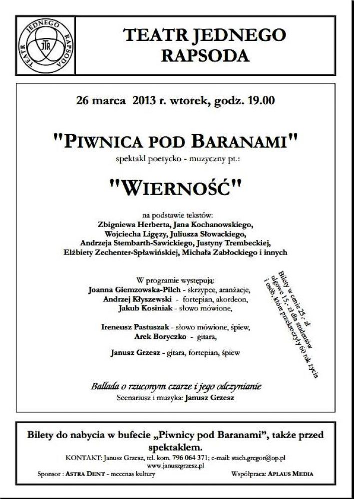 "PIWNICA POD BARANAMI" spektakl poetycko - muzyczny pt.: "WIERNOŒĆ"