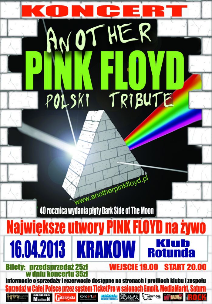 Zespół Pink Floyd to zarówno dla fanów, jak i krytyków, muzyczny fenomen wszechczasów. Mimo że zespół nie koncertuje już od kilkunastu lat, a jego ostatnia płyta ukazała się prawie 20 lat temu, nadal zajmuje czołowe miejsca na listach sprzedaży wszechczasów. Legendę zespołu utrwalajš liczne zespoły coverujšce twórczoć Floydów, w tym ten najbardziej znany, z Australii, który od kilku lat regularnie odwiedza Polskę i wypełnia największe hale widowiskowe w kraju. Koncerty te nie sš jednak dostępne dla każdego rozmach przedsięwzięcia przekłada się na cenę biletu, dodatkowo trzeba pokonać nieraz kilkaset kilometrów, by dotrzeć na miejsce. Czy istnieje zatem bardziej dostępna alternatywa? ANOTHER polski tribute to Pink Floyd! Branie na warsztat muzyki Pink Floyd obarczone jest dużym ryzykiem. Fani Floydów to wymagajšca publika i sprostanie oczekiwaniom takich słuchaczy jest wyzwaniem. By odtworzyć przynajmniej częciowo klimat koncertu PF potrzeba posiadać odpowiedni warsztat, przygotowanie muzyczne i przede wszystkim czuć tę muzykę duszš i sercem. Takie warunki zostały spełnione wiosnš 2009 roku w Skawinie pod Krakowem, łšczšc muzyków a zarazem pasjonatów Pink Floyd. Tak powstała grupa ANOTHER jako pierwszy i przez długi czas jedyny w Polsce tribute Pink Floyd. Zespół skupia się na graniu głównie w klubach, stšd ze względów technicznych trudno włšczyć w występ pewne elementy, znane z koncertów pierwowzoru nie oczekujmy zatem wielkich ekranów, trójwymiarowych wizualizacji, walšcych się na scenę gigantycznych cian. Ograniczona przestrzeń klubu nadaje natomiast koncertom wyjštkowy kameralny klimat i atmosferę współuczestniczenia w wydarzeniu.