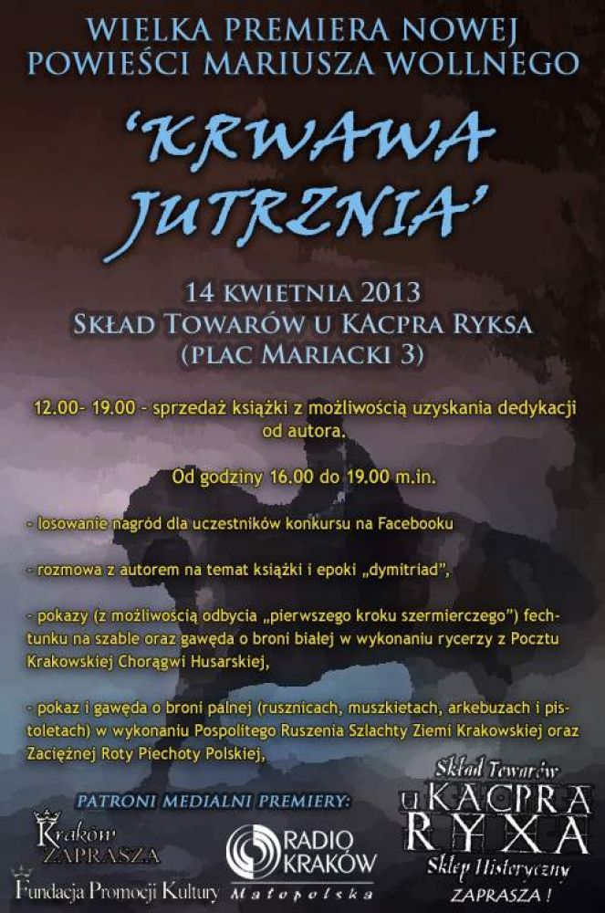 Skład Towarów u Kacpra Ryksa oraz Mariusz Wollny zapraszajš serdecznie na uroczystš premierę jego nowej powieci pt. Krwawa Jutrznia. Autor znany głównie z serii ksišżek o XVI-wiecznym Inwestygatorze Królewskim Kacprze Ryksie tym razem bierze na warsztat wydarzenia słynnych dymitriad, w które (wbrew swojej woli) wplštany zostaje syn Kacpra, Ryx Junior