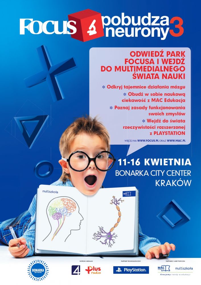 W specjalnie zaaranżowanej przestrzeni (poziom 0 i poziom 1 przy salonie Empik) każdy chętny i ciekawy œwiata będzie mógł za darmo przekonać się, jak powinna wyglšdać szkoła przyszłoœci. Taka, w której zamiast tablicy i kredy wykorzystywane sš zaawansowane rozwišzania technologiczne. Gdzie zamiast siedzenia w ławce można zanurzyć się w œwiecie 3D, a podręczniki zastšpione zostały nowoczesnymi materiałami edukacyjnymi - takie właœnie unikalne doœwiadczenie oferuje krakowska Bonarka. Wystawa „Focus pobudza neurony” to coœ zdecydowanie więcej niż tylko nowe i zaawansowane ciekawostki, to przede wszystkim szansa, by dowiedzieć się czegoœ więcej o pracy ludzkiego mózgu i działaniu narzšdów zmysłów.