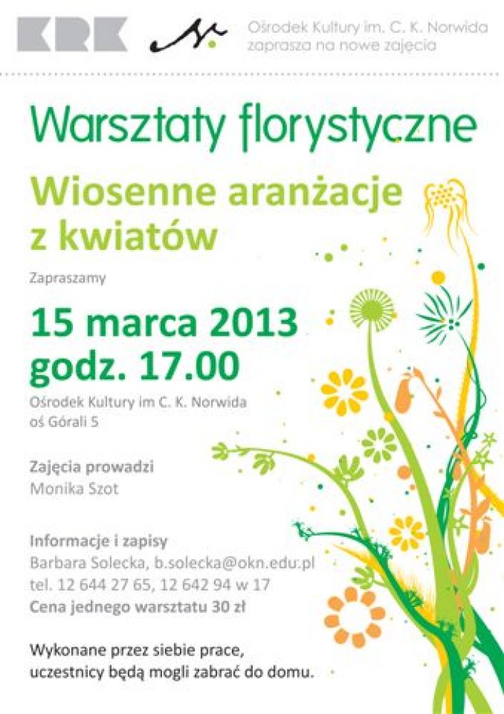 Zapraszamy na warsztaty florystyczne do Orodka Kultury im. C. K. Norwida. Warsztaty pozwolš zdobyć umiejętnoci tworzenia różnorodnych kompozycji z kwiatów, dekorowania stołu i pomieszczeń. Zapoznajš uczestników z zasadami kompozycji, pozwolš poznać różnorodne możliwoci użycia materiału rolinnego, doboru kolorów, dodatków i innych elementów decydujšcych o efektownej dekoracji florystycznej. Zajęcia prowadzi Monika Szot - dyplomowana florystka, która swojš pasjš do kwiatów potrafi zarazić wszystkich dookoła. Cena 30 zł za jeden warsztat od osoby.