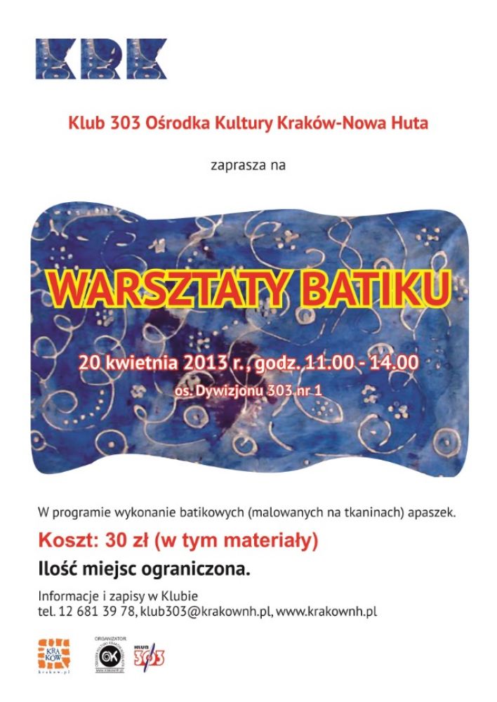 Wszystkie osoby, które chciałyby nauczyć się tej techniki i wykonać oryginalne apaszki, zapraszamy 20 kwietnia br. w godz. 11.00-14.00 na zajęcia do Klubu 303 Orodka Kultury Kraków-Nowa Huta (os. Dywizjonu 303 nr 1).