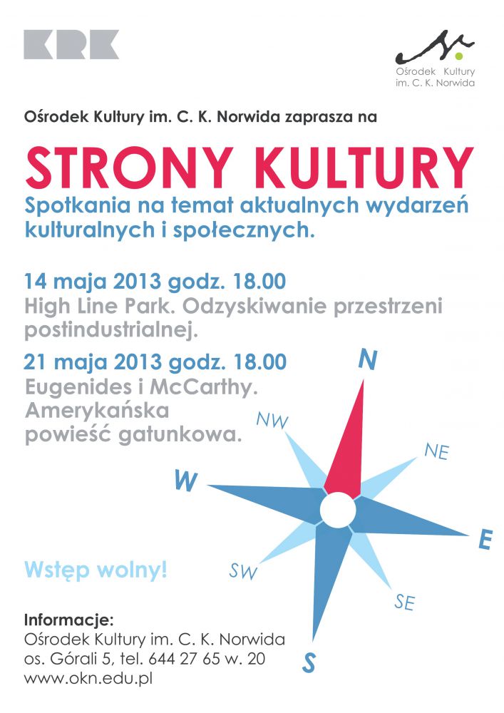 Strony Kultury to cykl spotkań nt. aktualnych wydarzeń kulturalnych oraz prezentacja zwišzanych z nimi stron internetowych. Otwarty charakter spotkań umożliwia zaangażowanie uczestników i proponowanie ich własnych tematów, wydarzeń.