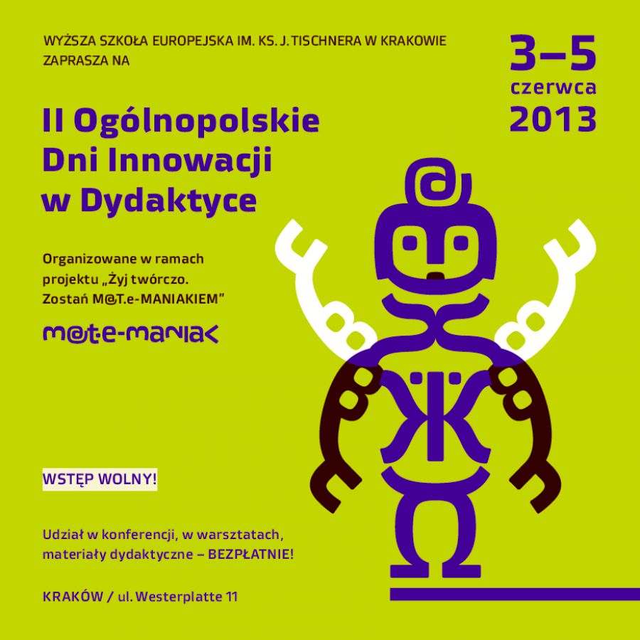 W dniach 3-5 czerwca 2013 roku Wyższa Szkoła Europejska im. ks. Józefa Tischnera zaprasza do udziału w II Ogólnopolskich Dniach Innowacji w Dydaktyce, organizowanych w ramach projektu Żyj twórczo. Zostań M@T.e-MANIAKIEM. Wydarzenie odbędzie się w siedzibie głównej uczelni, przy ul. Westerplatte 11 w Krakowie.