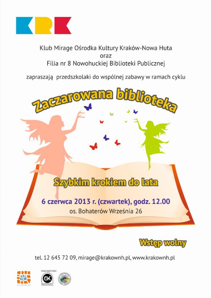 Klub Mirage Orodka Kultury Krakw-Nowa Huta (os. Bohaterw Wrzenia 26) zaprasza 6 czerwca br. o godz. 12.00 na kolejne zajcia edukacyjno-relaksacyjne dla przedszkolakw z cyklu Zaczarowana biblioteka.