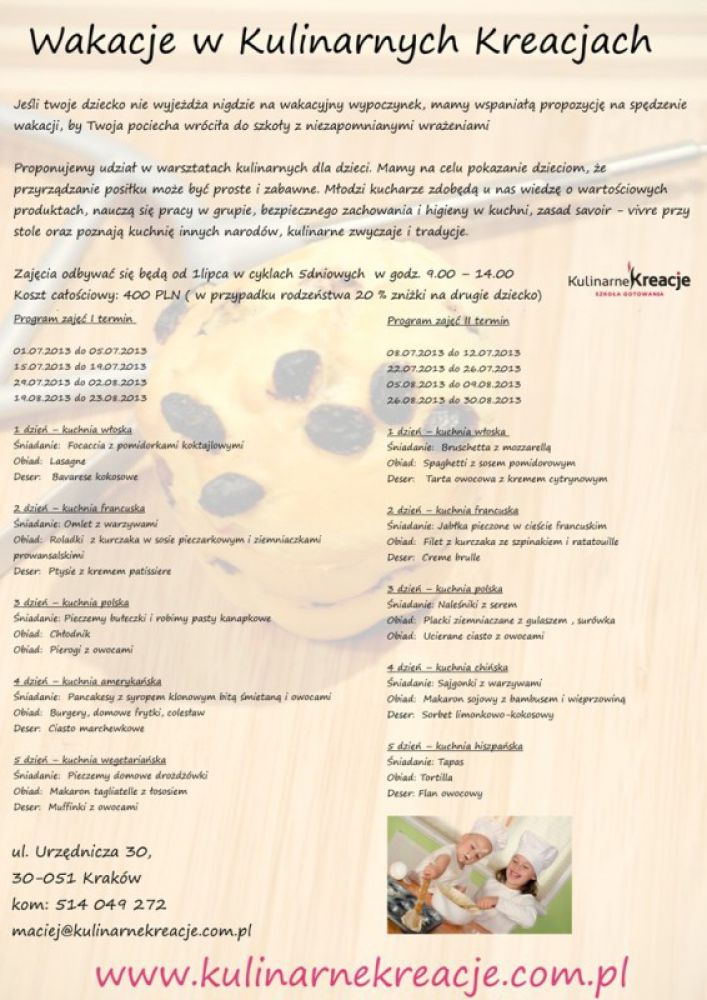 Cena obejmuje: 5 dniowe warsztaty kulinarne, zakup wszystkich potrzebnych składników, z których dzieci wykonajš potrawy, napoje, fartuszki, opiekę wykwalifikowanych osób dorosłych. Każda dodatkowa godzina po wczeniejszym ustaleniu + 20 PLN