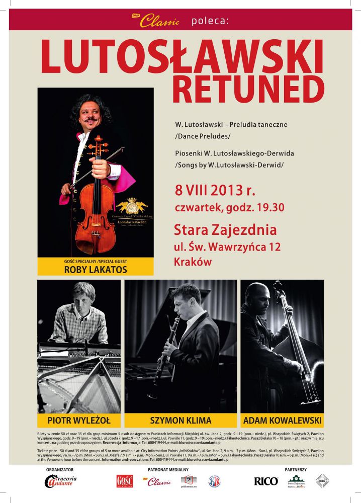 Na program koncertu składajš się „Preludia taneczne” w oryginale napisane przez Witolda Lutosławskiego na klarnet z fortepianem, które dzięki interpretacji muzyków zyskajš nowe, niepowtarzalne brzmienie i oryginalnš interpretację nieklasycznš z licznymi improwizacjami jazzowymi. Goœciem specjalnym koncertu będzie Roby Lakatosa, który wraz z Trio zaprezentuje utwory komponowane przez Lutosławskiego pod pseudonimem Derwid.