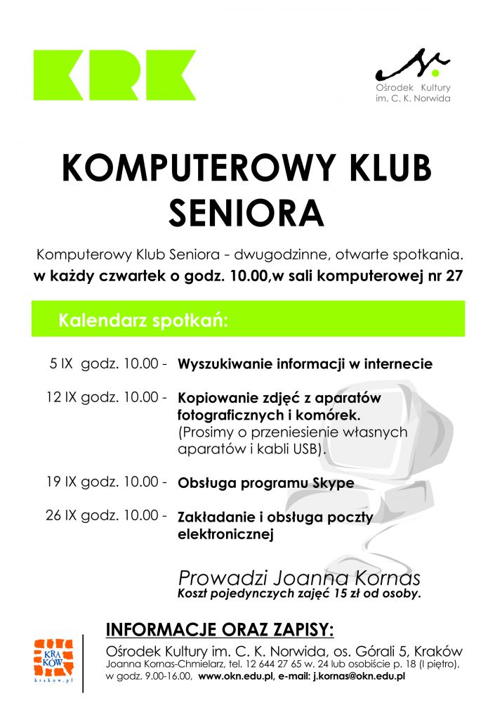 Zapraszamy do Oœrodka Kultury im. C. K. Norwida na dwugodzinne otwarte spotkania komputerowo-internetowe dla Seniorów.