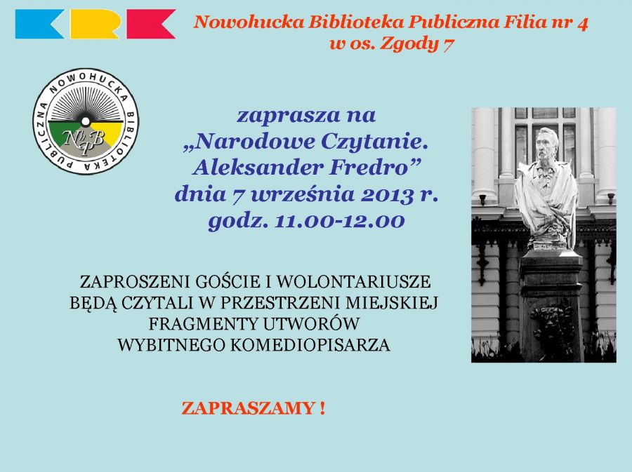 Nowohucka Biblioteka Publiczna w Krakowie włšczyła się do ogólnopolskiej akcji "Narodowe Czytanie. Aleksander Fredro" i organizuje 7 wrzeœnia 2013 roku czytanie wybranych utworów hr. Aleksandra Fredry - polskiego poety, pamiętnikarza, bajkopisarza i komediopisarza, którego utwory weszły na stałe do kanonu polskiej literatury i do repertuaru teatrów. Zaproszeni goœcie i wolontariusze będš czytali w przestrzeni miejskiej. Wœród goœci znajdš się redaktorzy Głosu. Tygodnika Nowohuckiego i Przewodniczšcy Rady Dzielnicy XVIII.