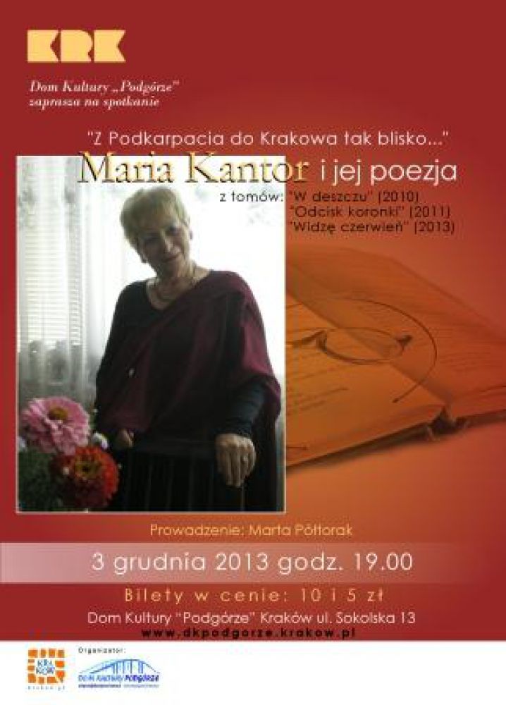 Podczas wieczoru zabierzemy Państwa w sentymentalnš podróż po ważnych miejscach dla autorki - po miejscach, gdzie spędziła dzieciństwo, młodoœć. Zajrzymy do miejsc – domów, miasteczek, pól, koœciołów, gdzie się wychowywała, i do których wraca także w swoich wierszach. Maria Kantor pokaże Państwu także swoje miejsca w Krakowie, studia, kolegów ze studiów, a także swoje obecne życie w Krakowie. Będziemy mogli zajrzeć na ryneczki miast, do kapliczek, na łški… ale przede wszystkim do wnętrza serca p. Marii bogatego w poezje i jej obrazowoœć. Bo poezja Marii Kantor to zapis emocjonalny, pełen rekwizytów, retrospekcji i delikatnych metafor. O najnowszym tomiku poetki „Widzę Czerwień”(2013), tak pisze Beata Anna Symołon : „Autorka już wielokrotnie odwoływała się do swoich podkarpackich korzeni. Tym razem nie przywołuje minionych historii, lecz z detali, z tego co najważniejsze (ciepła rodzinnego domu, smaków, zapachów, klimatów, uœmiechów œwištków…), tworzy spokojnš przystań, do której można zawsze się odwołać w trudnych chwilach niespokojnej teraŸniejszoœci. Przeszłoœć jest rozbielona, ale i ocieplona, a nade wszystko – bezpieczna.” Natomiast Anna Kajtochowa tak okreœliła poezję MK ( na podst. W Deszczu) „ wzrusza, zmusza do myœlenia, uczy jak żyć w zgodzie ze sobš, otoczeniem, przyrodš i ludŸmi. I cieszyć się istnieniem mimo upływu lat.”