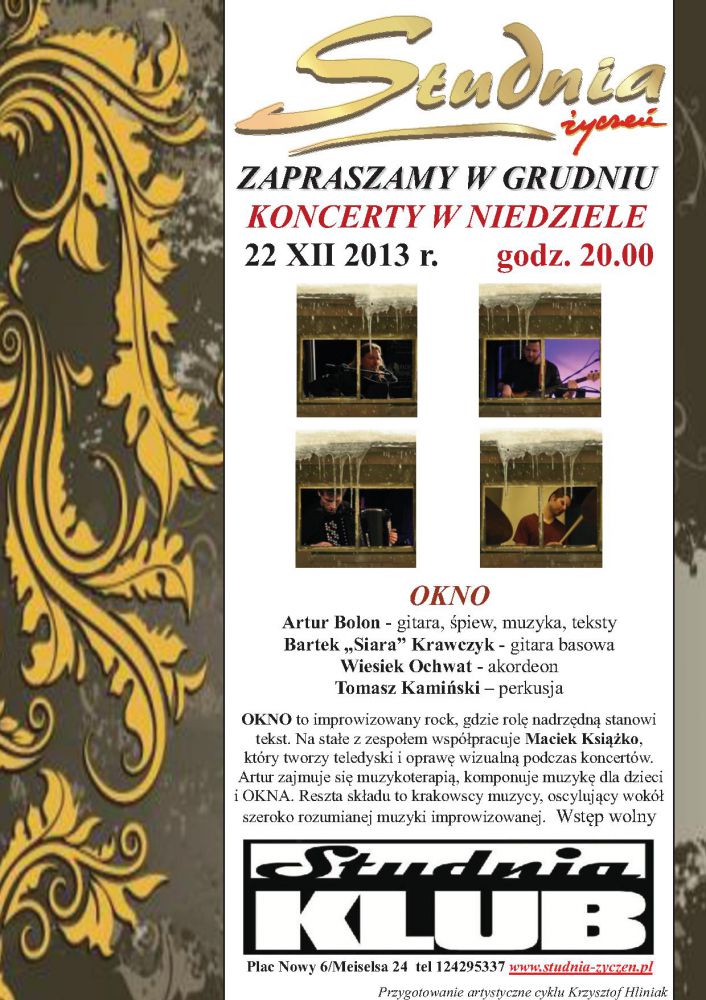 Artur zajmuje się muzykoterapiš, komponuje muzykę dla dzieci i OKNA. Reszta składu to krakowscy muzycy, oscylujšcy wokół szeroko rozumianej muzyki improwizowanej. Wstęp wolny