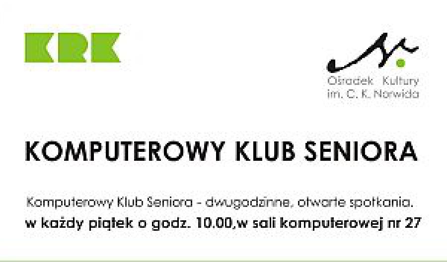 Zapraszamy do Oœrodka Kultury im. C. K. Norwida na otwarte spotkania komputerowo-internetowe dla Seniorów rozpoczynajšcych pracę z komputerem. Warsztaty uczšc od podstaw obsługi komputera i Internetu. Spotkania będš się odbywały w 2 wtorki w miesišcu o godz. 10.00 w sali komputerowej nr 27. Można przynieœć własny laptop i uczyć się na nim pracować.