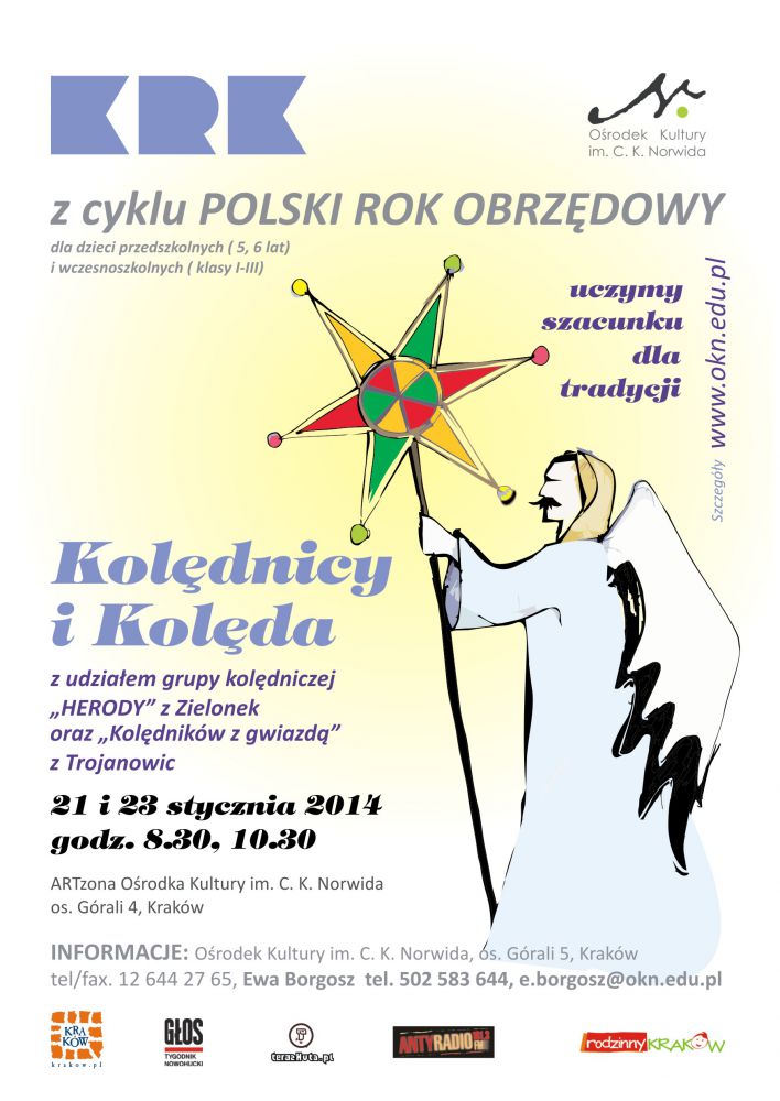 Zapraszamy na imprezy edukacyjne dla zorganizowanych grup dzieci w wieku przedszkolnym i wczesnoszkolnym (klasy 0-III) realizowane w ramach cyklu Polski rok obrzędowy. Wystšpi najlepsza w Małopolsce grupa kolędnicza HERODY z Zielonek, wielokrotni zdobywcy Złotych spinek podczas Festiwalu w Bukowinie Tatrzańskiej i "Kolędnicy z gwiazdš " z Trojanowic. Opowiemy o cudownych obrzędach, tradycjach i zwyczajach okresu Bożego Narodzenia w tym o chodzeniu po kolędzie, kolędowaniu i kolędnikach, zapiewamy razem z kolędnikami najbardziej znane kolędy. Dzieci wezmš udział w okolędowaniu, złożymy tradycyjne życzenia noworoczne, sypišc owsem na obfitoć.