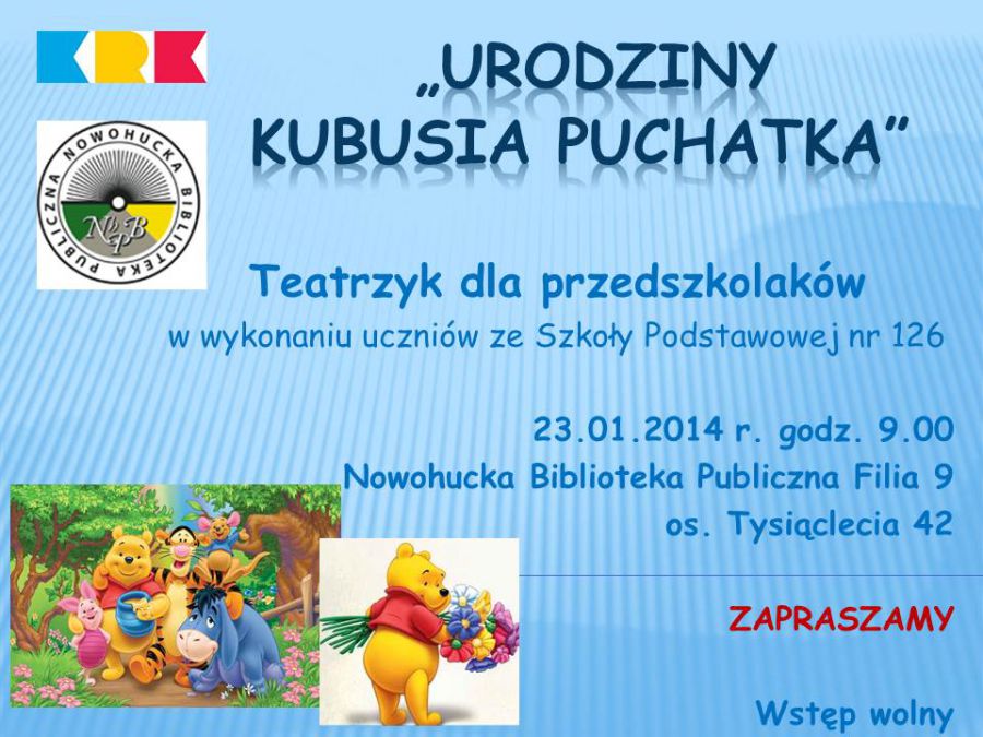 W cyklu: Dzieci dzieciom uczniowie Szkoy Podstawowej nr 126 w Nowej Hucie wystawi przedstawienie pt. Urodziny Kubusia Puchatka. Dzieci w wieku przedszkolnym, do ktrych kierowany jest spektakl teatralny poznaj bohaterw ksiki angielskiego pisarza Alana Alexandra Milne. Kubu Puchatek, Prosiaczek, Tygrysek, Krlik, Osioek, Mama Kangurzyca, Malestwo, Mdra Sowa, So, Krzy to bajkowe postaci cieszce si niesabnc popularnoci prawie od 90 lat.