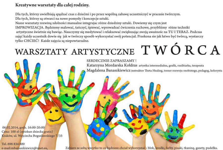 Warsztaty rozwijajš zdolnoci manualne integrujac różne dziedziny sztuki. Dowiemy się czym jest IMPROWIZACJA. Będziemy malować, tańczyć, piewać, wprowadzać ćwiczenia ruchowe, przybliżmy różne techniki artystyczne wietnie się bawišc. Nauczymy się medytować i relaksować zwiększajšc swojš uważnoc na TU I TERAZ. Podczas zajęć każdy uczestnik dowie się jak w twórczy sposób wykorzystać swój potencjał. Przekona się jak łatwo być twórcš, wystarczy tylko CHCIEĆ!