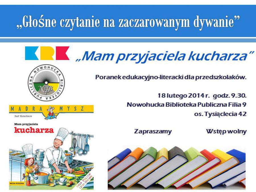 Jeli chcesz si dowiedzie jak przyrzdzi najlepsze spaghetti, pozna jego skadniki i przyprawy przyjd do Filii nr 9 Nowohuckiej Biblioteki Publicznej w Krakowie na Poranek edukacyjno-literacki dla dzieci w wieku przedszkolnym. Zajcia odbywaj si w cyklu: Gone czytanie na zaczarowanym dywanie. Tytu spotkania Mam przyjaciela kucharza, jeli wysuchasz bajki Ralfa Butschkowa dowiesz si jakie zawody wykonuj doroli. Autor w serii Mdra Mysz Zawody uczy szacunku do czowieka i do pracy.