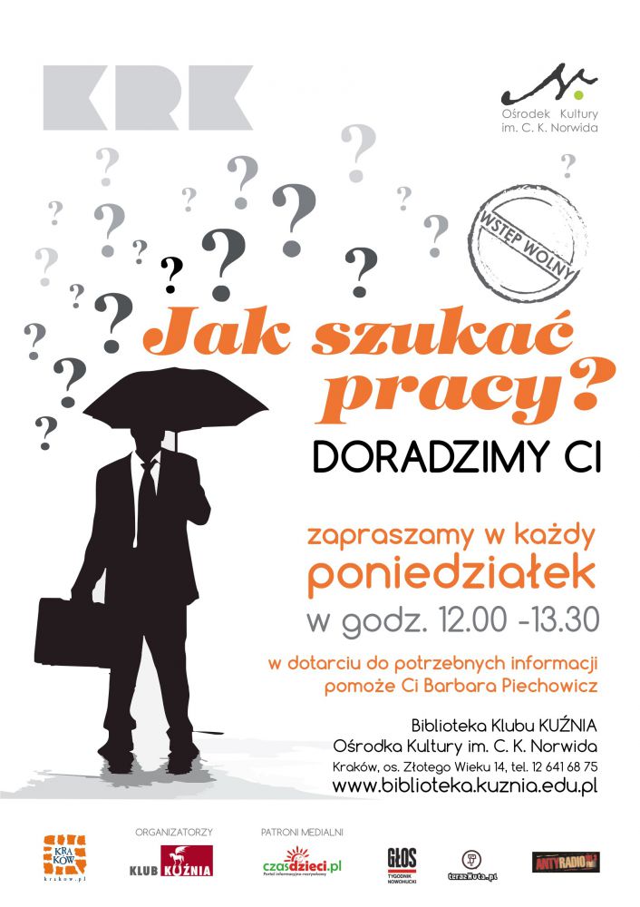Zapraszamy na konsultacje adresowane do osób, które poszukujš pracy. W każdy poniedziałek w godz. 12.00 – 13.30 w Bibliotece Klubu KuŸnia OKN pomożemy zainteresowanym w dotarciu do bieżšcych ofert pracy zamieszczonych na stronach internetowych oraz ogłoszeń prasowych, dostępnych w bibliotece.