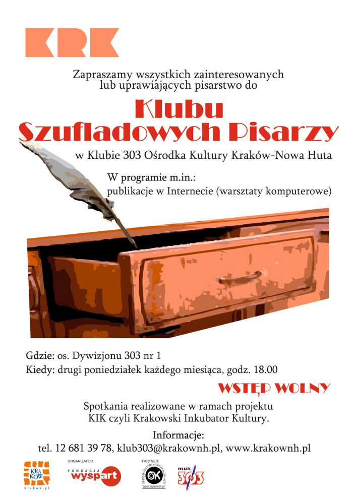 Kolejne spotkanie dla osb zainteresowanych lub uprawiajcych pisarstwo w Klubie 303 Orodka Kultury Krakw-Nowa Huta (os. Dywizjonu 303 nr 1). Klub zakada wsplne czytanie utworw, doskonalenie si w sztukach edycyjnych przy uyciu komputerw, wczanie si w rodowisko twrcw publikujcych w Internecie. Spotkania odbywaj si w drugi poniedziaek kadego miesica. Moderuje je Barbara Kozub-Marczyk, poetka amatorka. Informacje i zapisy w Klubie (tel. 12 681 39 78, klub303@krakownh.pl).