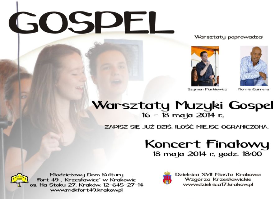 Młodzieżowy Dom Kultury Fort 49 Krzesławice w Krakowie zaprasza wszystkich tych dla, których piewanie jest radociš i chęciš wyrażania siebie na warsztaty Muzyki Gospel, które odbędš się w dniach od 16 do 18 maja 2014 roku. Uczestnicy będš mieli niecodziennš okazję piewać pod kierunkiem Szymona Markiewicz oraz Norrisa Garnera. Wydarzenie zakończone zostanie koncertem finałowym na dziedzińcu fortecznym, na który serdecznie zapraszamy w dn. 18 maja 2014 roku.