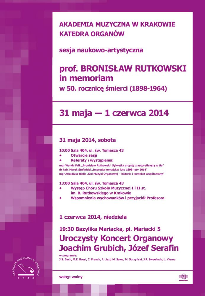 31 maja, poczšwszy od godziny 10:00 w Sali organowej 404 zostanš wygłoszone trzy referaty wraz z prezentacjš multimedialnš, powięcone różnym aspektom życia i działalnoci Bronisława Rutkowskiego, natomiast o godzinie 13:00 pieni autorstwa Profesora zaprezentuje Chór Szkoły Muzycznej I i II st. im. B. Rutkowskiego w Krakowie. Po występie będzie czas na wspomnienia wychowanków i przyjaciół Rutkowskiego.